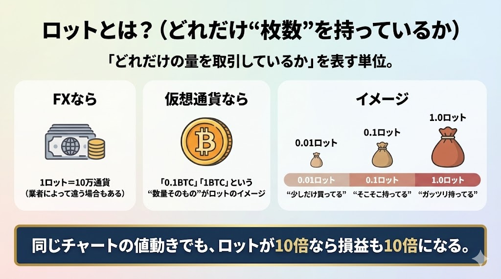 - 仮想通貨なら:「0.1BTC」「1BTC」という“数量そのもの”がロットのイメージ