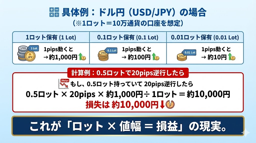 「1ロット × 1pips動くと、いくら損益が動くのか?」